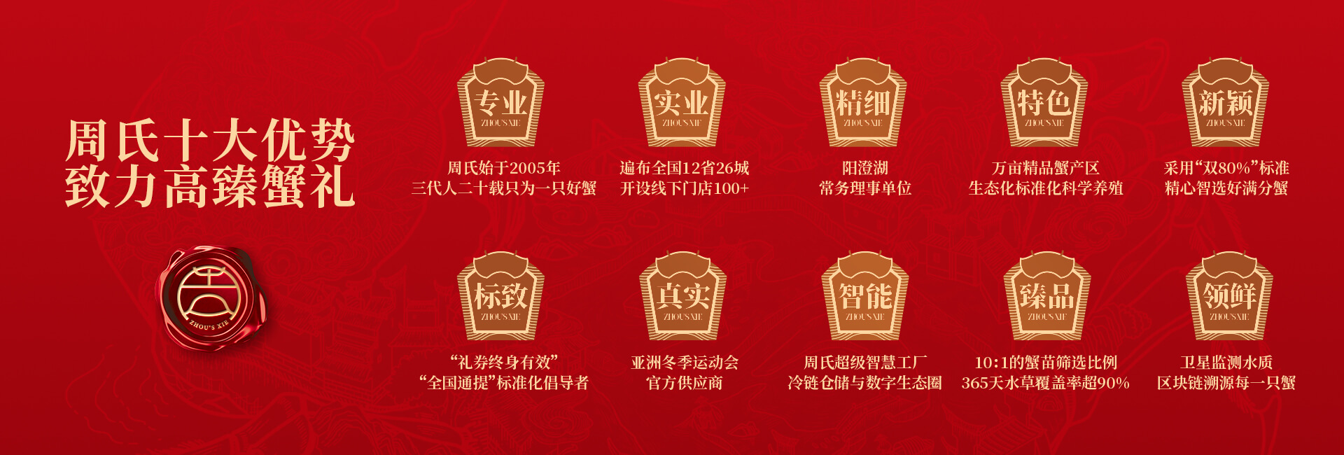 周氏水產(chǎn)精品大閘蟹,14年匠心沉淀,全國87家直營門店,100只大閘蟹只精選最優(yōu)50只。不虛標規(guī)格,不玩???